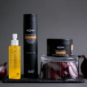 Dabīgs šampūns ar Hairdensyl kompleksu un Sarkano Sīpolu ekstraktu 300ml Dabīgs šampūns ar Hairdensyl kompleksu un sarkanā sīpola ekstraktu paredzēts plāniem, bojātiem matiem. Tas samazina matu izkrišanu, stimulē matu augšanu, atjauno matu struktūru, palielina apjomu un novērš to priekšlaicīgu novecošanos. Lietot uz mitriem matiem, tad noskalot. Nesatur alkoholu, parabēnus un SLS. Dabīga matu maska ar Hairdensyl kompleksu un Sarkano Sīpolu ekstraktu 200ml Dabīga matu maska ar Hairdensyl kompleksu un sarkanā sīpola ekstraktu baro plānus un bojātus matus, samazina matu izkrišanu, stimulē matu augšanu un atjauno matu struktūru. Palielina matu apjomu un novērš to priekšlaicīgu novecošanos. Lietot uz mitriem matiem, tad noskalot.Bio2You komplekti matiem — gatavas produktu kombinācijas ērtai rutīnai un izdevīgam pirkumam. Lieliski, lai vienā komplektā iegūtu šampūnu + masku/kondicionieri + serumu gludākiem, mīkstākiem un koptākiem matiem, vai izvēlētos praktisku dāvanu.