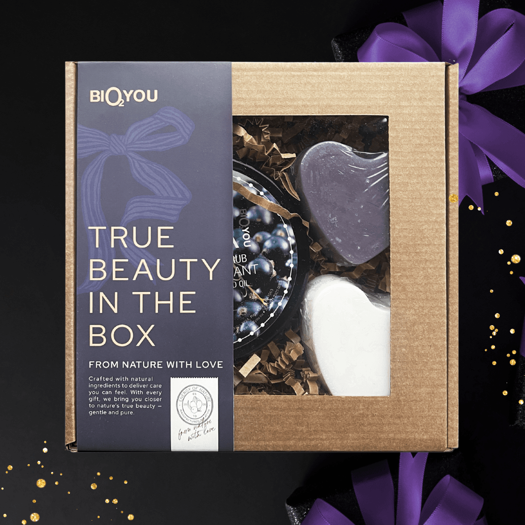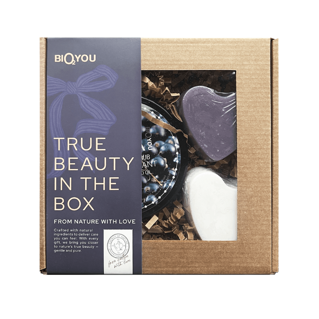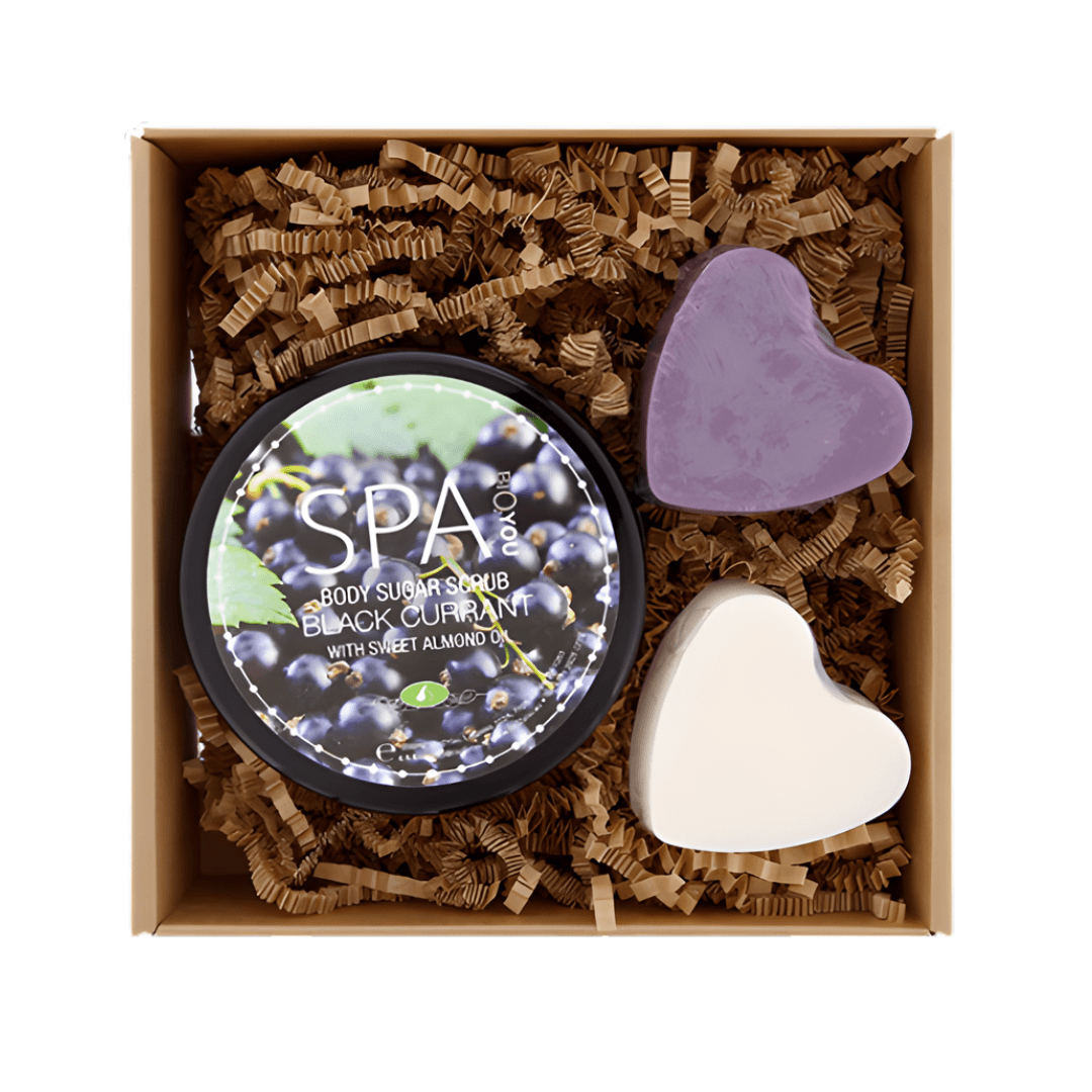 Dāvanu komplekts – Ķermeņa cukura skrubis Upene, Ziepes Lavanda, Ziepes Kazas Piens